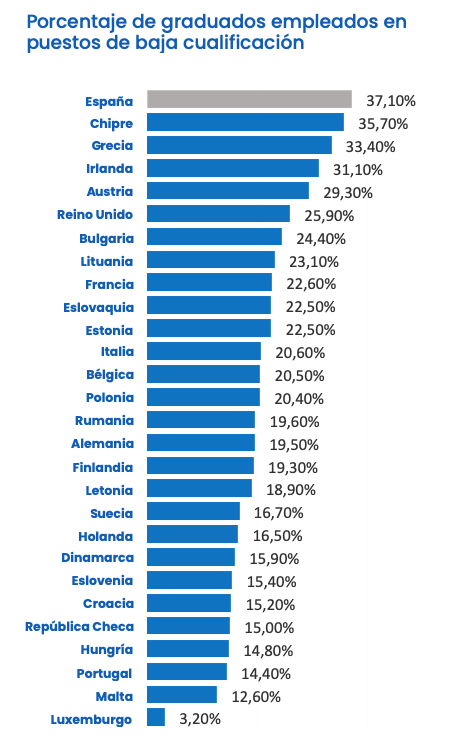 E: Uff, espero que cuando vuelva con el título de EE. UU. no entre en las estadísticas de los sobrecualificados, porque con el sistema educativo que hay en mi país... con un presupuesto pequeño, sin que esté enfocado a la empleabilidad, fomentando el funcionariado, con un sistema productivo de muchos empleos de baja cualificación afiliados a la picaresca, con unos políticos que intentan meterle doctrinas continuamente, si religión o ciudadanía, si exámenes para pasar o repetir, si más o menos lenguas… Vaya, todas las cosas importantes menos pensar en cómo los estudiantes adquieren más capacidades y más pensamiento.
