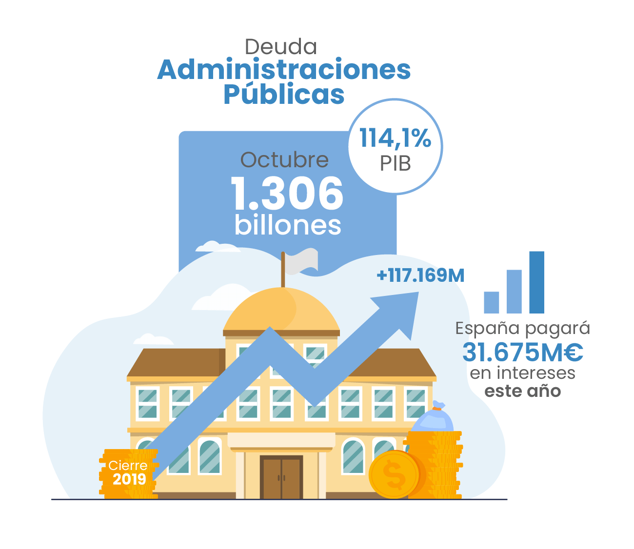 La deuda de las administraciones públicas a octubre es de 1.306 billones de euros, un 114,1% del PIB, son 117.169 millones más que a cierre de 2019.