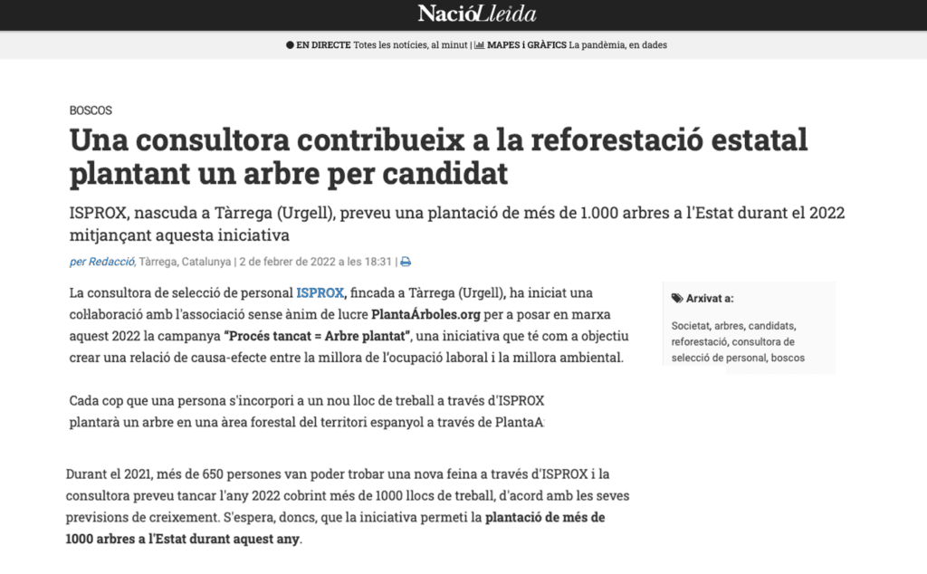 ISPROX pone en marcha una colaboración con la asociación sin ánimo de lucro Tree-Nation.com en la que, por cada candidato incorporado, plantarán un árbol en la geografía española, con el objetivo de crear una relación causa-efecto entre la mejora de la ocupación laboral y la mejora ambiental.