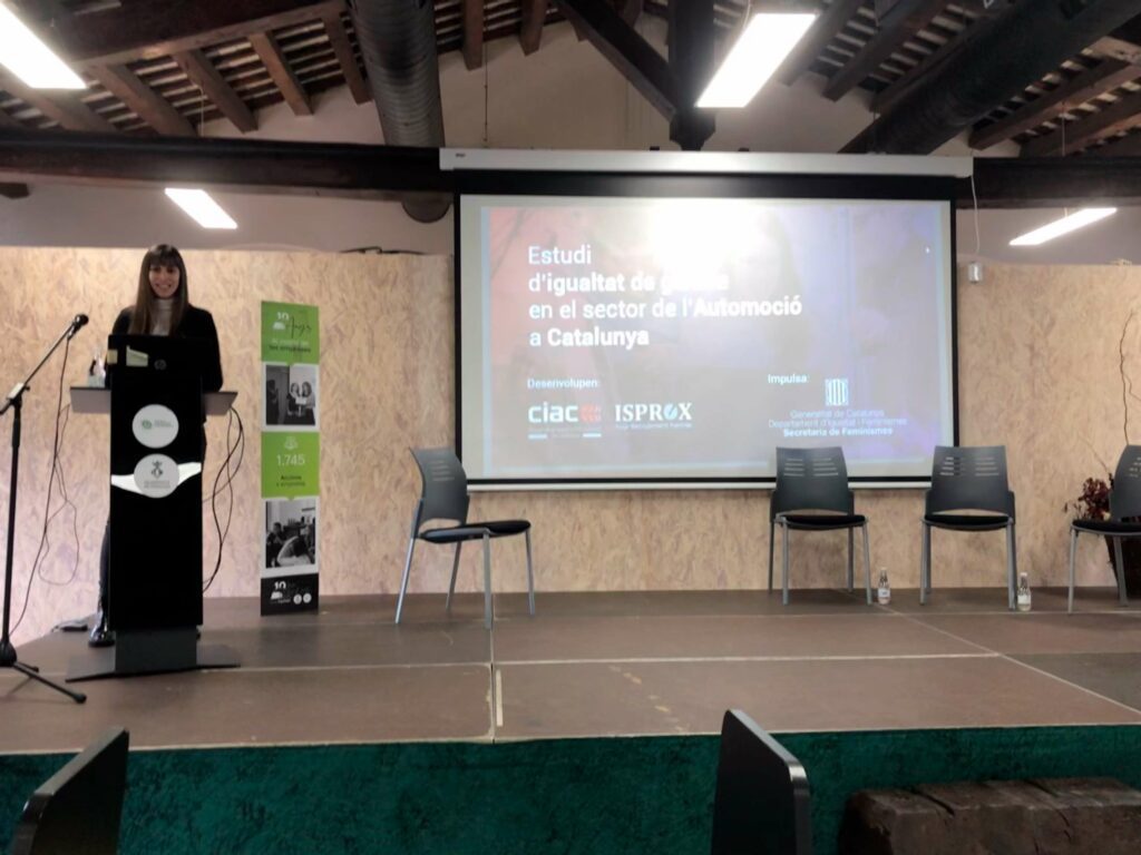 El pasado miércoles 22 de febrero de 2023, Alba Rius, nuestra Directora de Comunicación, presentó los resultados del estudio de igualdad de género en el sector de la automoción en Cataluña, realizado con el CIAC, en un evento presencial en Martorell.